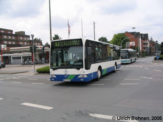 Jetzt steuern gleich zwei Busse auf einmal auf den Busbahnhof in Wesel zu: Vorne handelt es sich um einen EvoBus-Mercedes O 530 Citaro der NIAG (Wagen 3540); direkt dahinter folgt der RVN-Wagen 383, ein MAN NÜ 263.