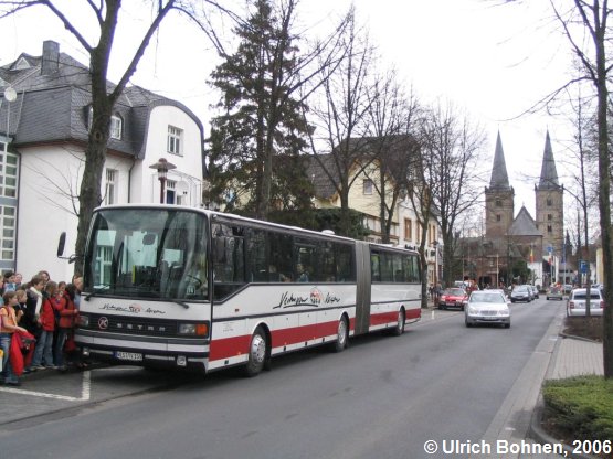 An einem Kreisverkehr hat der Bus gedreht, um an einer Haltestelle massig Schüler aufzunehmen. Im Hintergrund ist der Xantener Dom zu erkennen.