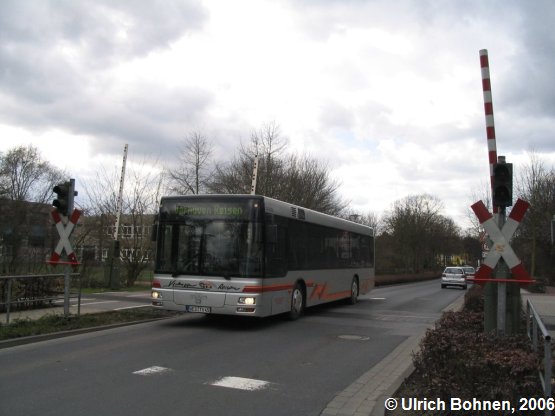 Den Bahnübergang der hier eingleisigen Strecke der Linie RB31 kurz vor dem Xantener Bahnhof überquert hier gerade der WES-TV 45.