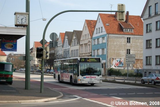 Der Firma Mietrach aus Bielefeld gehört dieser Citaro, der in der Bielefelder Innenstadt vor interessanter Gebäudekulisse digital festgehalten wurde.