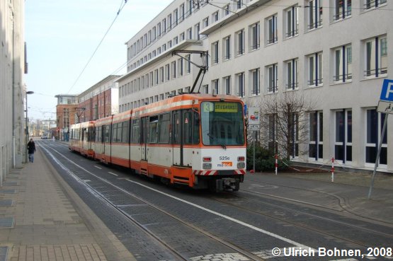 Bis auf eine Ausnahme wurden an diesem Samstag, den 05.03.2008, ausschließlich Doppeltraktionen (also zwei aneinander gekoppelte Straßenbahnen) gesichtet.