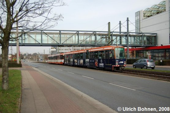 In den äußeren Bezirken von Bielefeld verkehren natürlich auch die Trams, hier Wagen 529 als Frontfahrzeug. Die Traktion kommt gerade aus Milse.