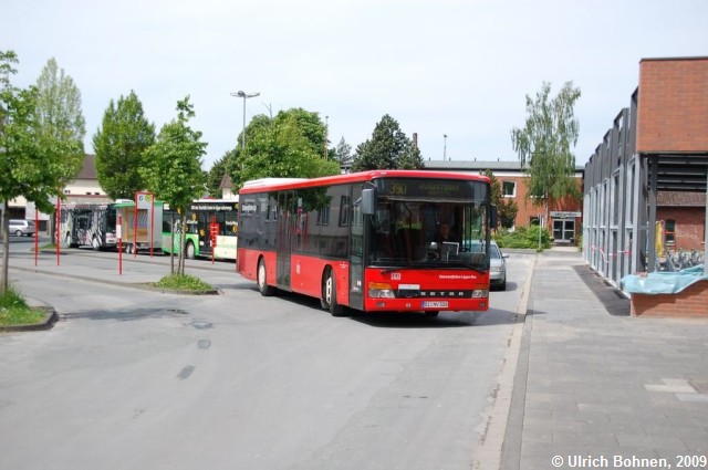 Gerade verlässt der BVO-Wagen 518 seine Haltestellenposition am Detmolder Bahnhof.