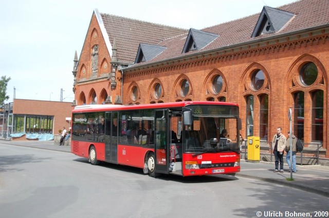 Schnell wurde jedoch noch ein Fahrgast mitgenommen. Im Hintergrund erhebt sich das Detmolder Bahnhofsgebäude.