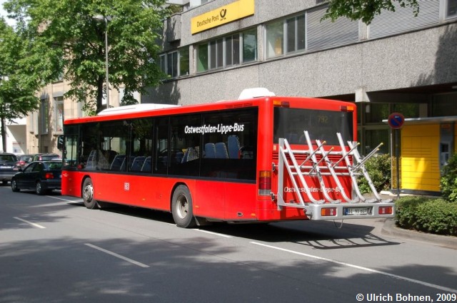Mit einem ziemlich wuchtigen Fahrradheckträger ist der BVO-Wagen 607 ausgestattet.