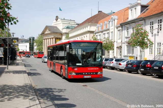Dieser Bus (zuvor mit dem Fahrradträger gezeigt) wurde am 09.05.2009 auf der Linie zum bekannten Hermannsdenkmal eingesetzt. Das Bild entstand an der zentralen Haltestelle Rosental in der sehr schönen Detmolder Innenstadt.