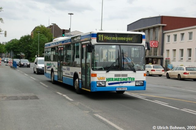 Die Firma Hermesmeyer ist in Paderborn als Subunternehmen des örtlichen ÖPNV-Anbieters "PaderSprinter" unterwegs. Dieser klimatisierte EvoBus-Mercedes O 405 N konnte auf einer Dienstfahrt vor dem Paderborner Hauptbahnhof fotografiert werden.