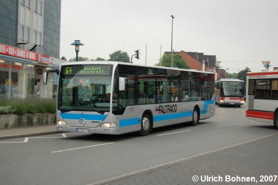 Werner Faltraco aus Wesel fährt u. a. im Auftrag der RVN (Regionalverkehr Niederrhein GmbH). Gerade den Bahnhof von Wesel erreicht hat dieser EvoBus-Mercedes O 530 Ü; die Matrix ist bereits für die Rückfahrt nach Bocholt umgestellt.