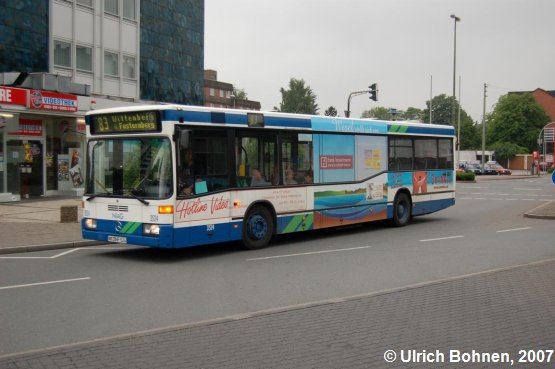 1995 wurde der NIAG-Wagen 3524 erstmals in Dienst gestellt. Der mit einer Werbung für die Stadt Wesel versehene EvoBus-Mercedes O 405 N² steuert ebenfalls gerade den Bahnhofsplatz, der in Wesel Franz-Etzel-Platz heißt, an.