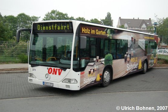 Der ONV-Wagen 271 trägt eine Vollreklame (unter Auslassung der Front) für einen Holzhändler und konnte am Pausenplatz am Bahnhof von Wesel abgelichtet werden.