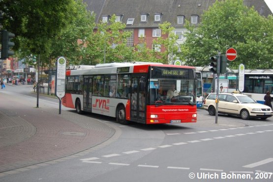 Am Königlichen Hof, der zentralen Haltestelle in Moers, wurde der umlackierte Wagen 383 der RVN ebenfalls fotografiert.