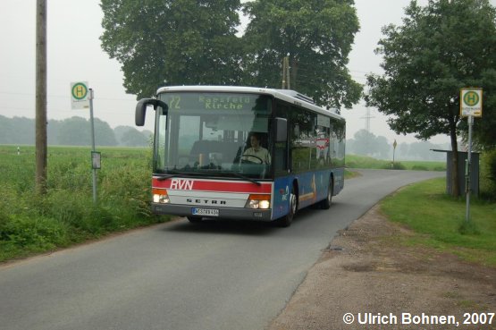 Auch über recht schmale Straßen führt die Linie 72 (Wesel - Raesfeld). Dieses Bild entstand an der Haltestelle Abzweig Erle-Marienthal, die zu Schermbeck gehört.