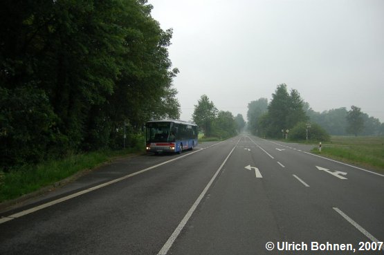 Auf der leeren B 70 in Richtung Raesfeld versucht der Fahrer, eine Verfrühung zu vermeiden, in dem er an der Haltestelle Havelich eine Zeit lang wartet.