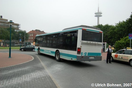 Der Bus ist noch in der "StädteSchnellBus"-Lackierung des VRR (Verkehrsverbund Rhein-Ruhr) gehalten. Im Hintergrund erkennt man den Fernsehturm in Wesel, dessen Spitze im Dunst verschwunden ist.