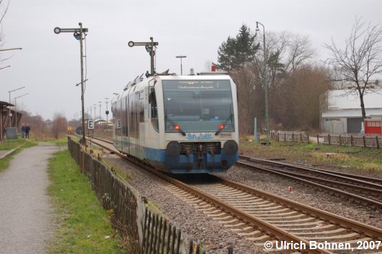 Hinten links stehen zwei Bahnmitarbeiter, die die Zugfahrgäste zum Ersatzbus lotsen.