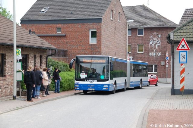 Die Ausstiegs- und Einstiegshaltestelle in Breyell war dörflich geprägt. Der auf die zu Langen gehörende Firma Strosser aus Elsdorf zugelassene MAN Lion's City G fährt die Haltestelle gerade an.