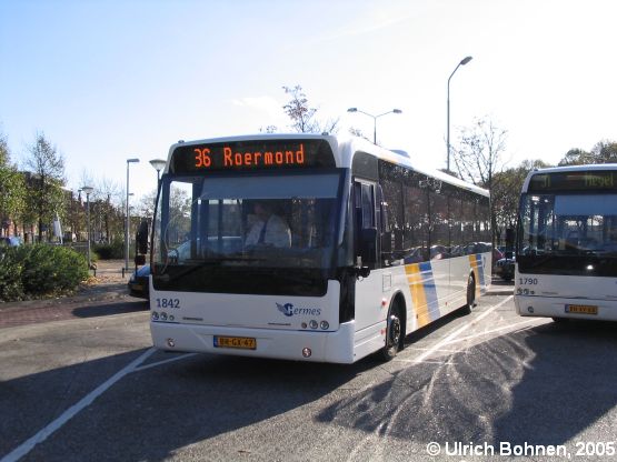 Nagelneu ist dieser Berkhof Ambassador 200 der Hermes, Wagen 1842, der erst im Herbst 2005 in Dienst gestellt worden ist. Die neuen Busse fallen durch die orange-farbene Matrix auf.