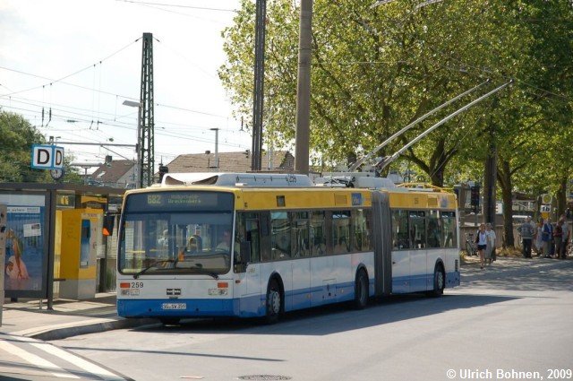 Wagen 259 mit seinen langen Stromabnehmern (daher werden die O-Busse auch "Stangentaxis" genannt) hält quasi direkt am Bahngleis - hier am Solinger Hauptbahnhof.