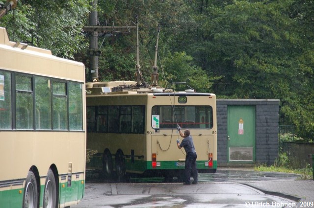 Hier nimmt ein Fahrer gerade die Stromabnehmer herunter, damit der O-Bus in Burg gedreht werden kann.