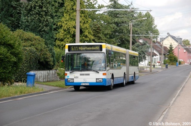 Ein Diesel-Gelenkbuskurs verkehrte auf der Linie 681. Der 1996 in Dienst gestellte Wagen 651 hat in Solingen-Hästen bereits seine leicht defekte Matrix für die Rückfahrt Richtung Solingen Hauptbahnhof umgestellt.