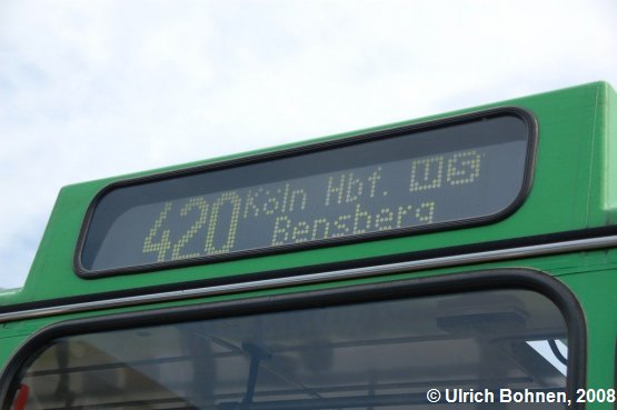 Das Besondere (und Ungewöhnliche) ist die Matrix-Anzeige an diesem Standard-I-Bus. Bis vor gar nicht allzu langer Zeit fuhr er auch noch nach Köln, was mittlerweile durch die dort eingeführte Umweltzone leider nicht mehr möglich ist.