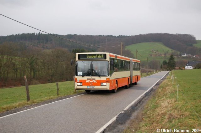 Jetzt geht's so richtig ins Bergische Land! Vor einer sehr schönen Kulisse sehen wir hier den Bus auf einem etwas besser ausgebauten Feldweg.