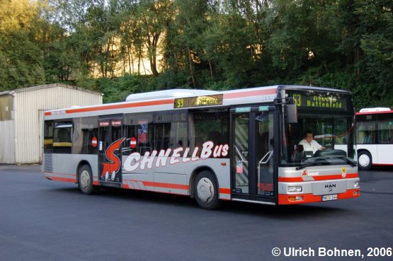 Als Schnellbus wird in der Regel dieser MAN NÜ 313, Wagen 144, eingesetzt und wurde daher mit einer auffälligen Lackierung bzw. Beklebung versehen.
