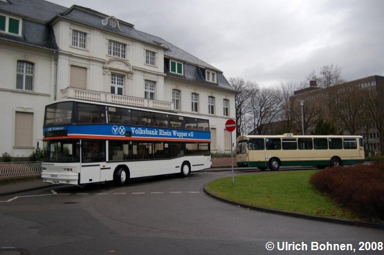 Die Firma Hüttebräucker aus Leichlingen setzt auch Neoplan-Doppeldecker ein. Dieser Neoplan N 424 konnte mit dem Sonderfahrt-Bus in der Nähe des Finanzamtes in Leverkusen-Opladen fotografiert werden.