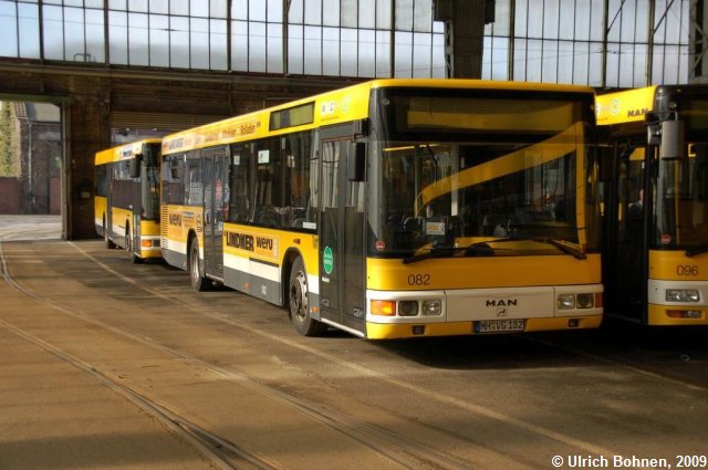 Bereits 1997 kamen die ersten MAN NL 223 in den Fuhrpark der MVG. Diese unterscheiden sich durch ein anders Frontdesign (besonders bei den Scheinwerfern) von ihren neueren Brüdern. Rechts neben Wagen 082 steht ein jüngerer MAN NL 223 zum Vergleich.