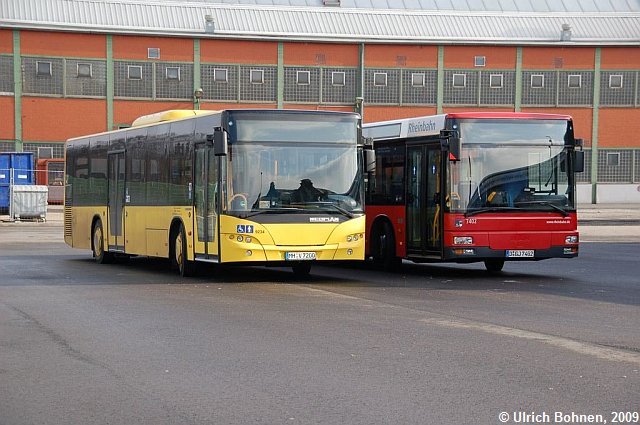 Recht farbenfroh zeigen sich links dieser Neoplan N 4516 Centroliner und rechts mit Wagen 7402 ein Leihwagen der Düsseldorfer Rheinbahn.