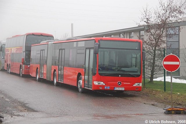 die RVE einen Mercedes-Gelenkbus in Dienst, der sich bereits in "bahnrot"