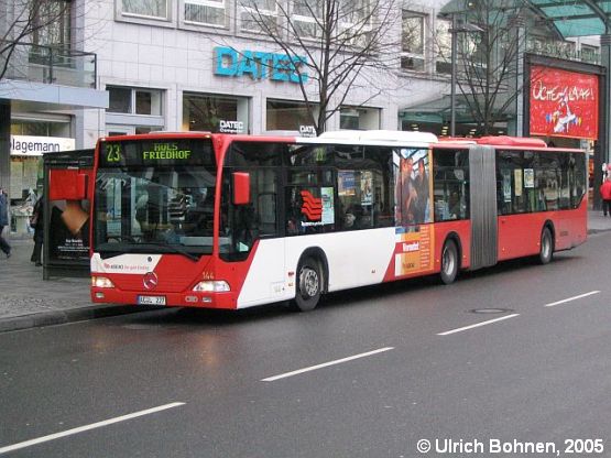 2003 beschaffte die ASEAG 20 EvoBus-Mercedes O 530 G (Citaro) und reihte diese mit den Nummern 136-155 in den großen Fuhrpark ein. Auch diese Fahrzeuge haben lediglich Lufttauscher auf dem Dach. Wagen 144 trägt eine ASEAG-Eigenwerbung und konnte am Aachener Elisenbrunnen aufgenommen werden.
