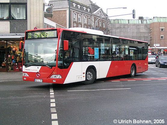 Die zum Aufnahmezeitpunkt neuesten Busse der ASEAG sind 20 EvoBus-Mercedes O 530 (Citaro), die im Sommer 2004 in Dienst gestellt worden sind. Wenn man sich das Dach ansieht, täuscht der erste Eindruck: Die Fahrzeuge sind nicht mit Klimaanlagen, sondern lediglich mit so genannten Lufttauschern versehen. Dem Fotografen gelang dieser Schnappschuss von Wagen 161 am 22.01.2005 in der Nähe der zentralen Haltestelle Bushof in Aachen.