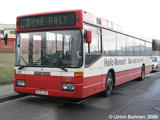 Den Abschluss dieser Fotoserie aus Aachen bildet das Bild eines Mercedes-Benz O 405 N der 1. Generation, der am 22.01.2005 vor dem ASEAG-Betriebshof aufgenommen werden konnte. Wagen 725, der von der ASEAG 1991 beschafft wurde, dürfte sicherlich bald von der Ausmusterung bedroht sein. Hier ist auch schön die "Aachener Variante", eine Dienstfahrt anzuzeigen, zu sehen: OHNE HALT