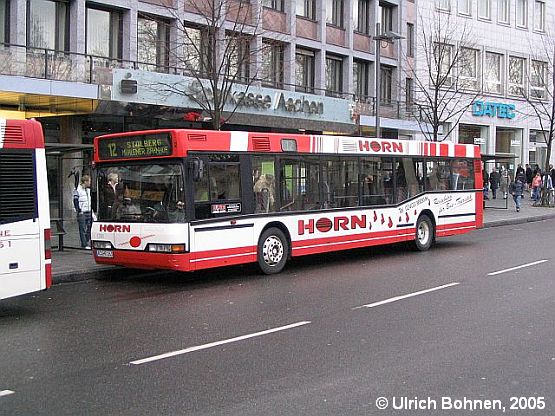 Die Firma Horn aus Eschweiler setzt u. a. diesen Neoplan N 4016 im Auftrag der ASEAG ein. Der KOM, der im Jahre 1996 erstmals zugelassen wurde, trägt eine Horn-Eigenwerbung und hält hier gerade am Elisenbrunnen im Zentrum Aachens. Nach kurzem Stopp wird dieses Fahrzeug seine Fahrt als Linie 12 nach Stolberg fortsetzen.