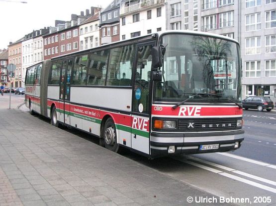 Hier einmal der schon auf dem vorherigen Bild angesprochene Kässbohrer-Setra SG 221 UL, den die BVR 1992 (mit einem Zwillingsbruder) beschaffte und 2003 (wiederum samt Bruder) an ihre Tochtergesellschaft RVE abgab. Man beachte auch die Fahrtzielanzeige (Dank dafür an Roland Schulteis!). Das Foto entstand am 22.01.2005 an der Haltestelle Normaluhr vor dem RVE-Büro, das aufgrund des roten Streifens im Hintergrund (durch das Fahrerfenster gesehen) zu erkennen ist.