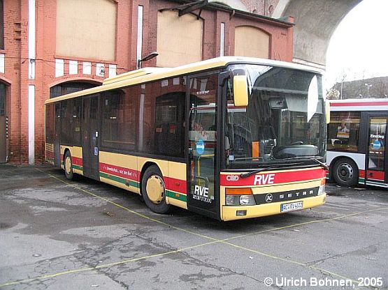 Ein Unikat im RVE-Fuhrpark ist dieser Setra S 315 NF. Einzigartig bei einem RVE-(Solo-)Bus sind nicht nur die 3 Türen, sondern auch die Lackierung in einem sanften Gelb-Ton, die zusammen mit den roten und grünen RVE-Streifen ein sehr stimmiges Bild abgibt. Der klimatisierte Wagen 4022 verstärkt seit August 2004 den Fuhrpark und war vorher ca. 2 Jahre lang ein Setra-Vorführwagen.