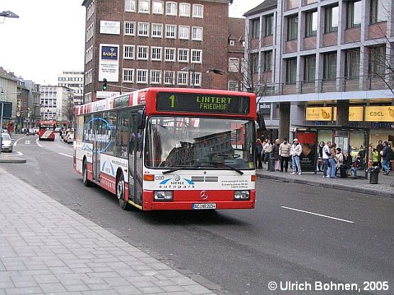 In Aachen ist es so, dass auch bei den Subunternehmern die Mehrheit der ASEAG-Auftragsfahrzeuge in den ASEAG-Farben lackiert ist. Ein Beispiel dafür ist dieser EvoBus-Mercedes O 405 N² von Rosenbaum aus Stolberg, der hier als Linie 1 in Richtung Lintert Friedhof gerade den Elisenbrunnen in Aachen anfährt.
