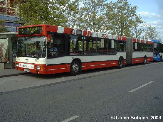 Wagen 870, ein MAN NG 262 aus dem Jahre 1999, ist ein Vertreter der mittlerweile nicht mehr verwendeten ASEAG-Lackierung. Auch dieses Foto gelang am 16.05.2003 vor der Uniklinik in Aachen. Hinter dem MAN ist der Doppelgelenkbus von Van Hool zu erkennen, der "lediglich" sechs Meter länger als ein normaler Gelenkbus ist.