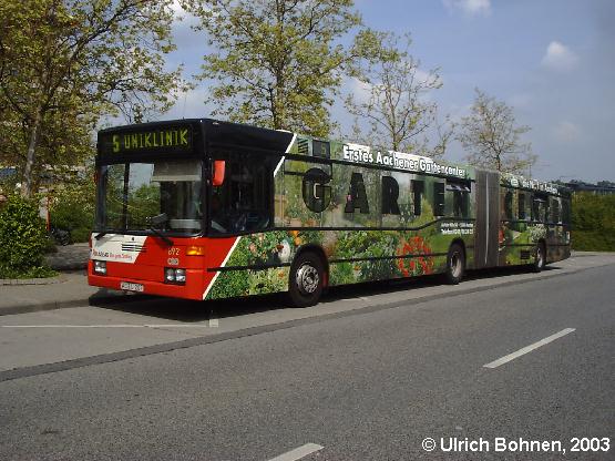 Wenigstens gibt es hier noch Gucklöcher für die Fahrgäste...! Dieser 2000er EvoBus-Mercedes O 405 GN2 wirbt unverkennbar für ein Gartencenter und konnte am 10.05.2003 wiederum vor dem Universitätsklinikum in Aachen nahe des Dreiländerecks Deutschland-Niederlande-Belgien aufgenommen werden.