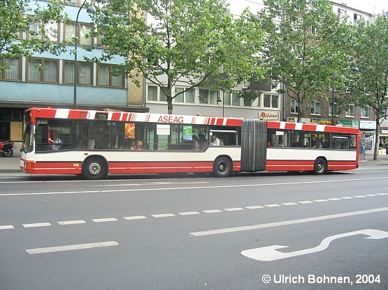Hier ein MAN A 11 (NG 272), der KOM 790 aus dem Jahre 1995, der die mittlerweile nicht mehr gebräuchliche ASEAG-Lackierung trägt, die durch die oberen, unterschiedlich breiten, Streifen doch recht charakteristisch ist und eigentlich immer noch zeitgemäß wirkt.