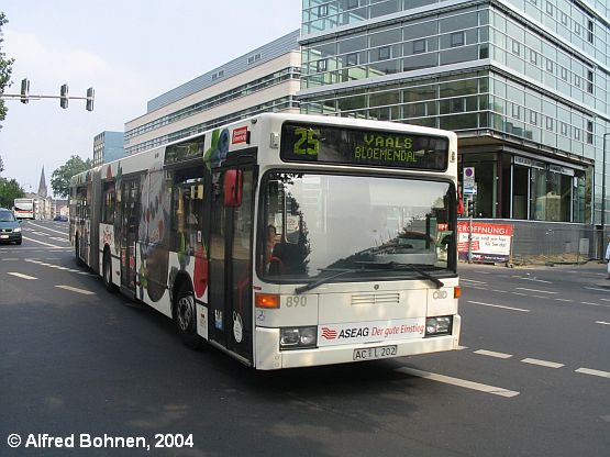 Für eine bekannte örtliche Marmeladen-Firma (Zentis) wirbt dieser EvoBus-Mercedes O 405 GN² der seit 1998 auf Aachens Straßen sein Umwesen treibt. Nachdem er den Bushof angefahren hat, wird die Fahrt als Linie 25 noch bis zur Endstation in die niederländische Grenzstadt Vaals führen.