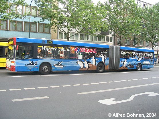 Eine ansprechende Gemeinschafts-Vollwerbung (die Front wurde ausgelassen) für die örtlichen Wasserwerke und den Aachener Tierpark trägt dieser EvoBus-Mercedes O 405 GN², der als Wagen 894 seit 1998 eingesetzt wird. Sogar die seitlichen Schutzleisten wurden mit Werbefolie überklebt.