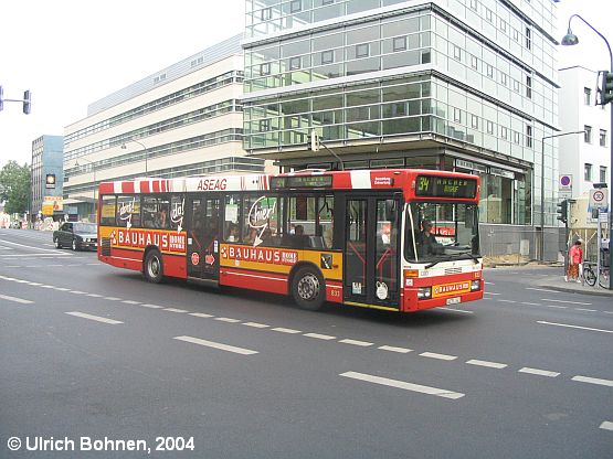 1998 beschaffte die ASEAG u. a. diesen EvoBus-Mercedes O 405 N², der auf dem Bild gleich seine Endstation auf der Linie 34 ansteuert. Die seitlichen Scheiben sind mit Ausdrücken wie "dort!", "da!" und "hier!" versehen und gehören zu einer ASEAG-Verkehrsmittelwerbung auf dem Heck. Der KOM ist wie alle Fahrzeuge dieses Typs bei der ASEAG mit einer elektrischen Rollstuhlrampe an der zweiten Türe ausgerüstet.
