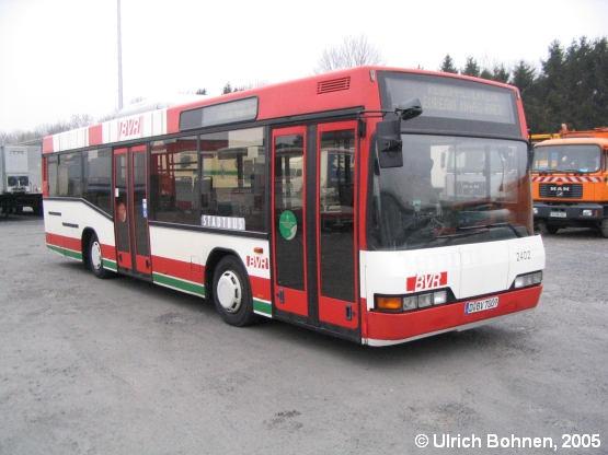 Etwa anderthalb Jahre - von der Gründung der BVR-Tochter RVE im Januar 2002 bis Juli 2003 - verweilte dieser Neoplan N 4011 bei der Regionalverkehr Euregio Maas-Rhein GmbH und wurde mit dem Kennzeichen AC-RV 5031 im Stadtbusverkehr Würselen (bei Aachen) eingesetzt. Aus diesem Grunde trägt das Fahrzeug auch eine Lackierung, die im oberen Teil dem Lackierungs-Schema der Aachener Verkehrsbetriebe ASEAG nachempfunden ist.