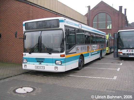Den Abschluss dieser zugegebenermaßen vom BVR-Fahrzeugen beherrschten Foto-Exkursion bildet ein Oldie (but Goldie): Der Wagen 17 der Niederrheinwerke Viersen, ein MAN SL 202 des Baujahres 1992, hat zum Aufnahmezeitpunkt am 26.02.2005 bereits 1,2 Millionen Kilometer auf der Uhr!!! Die Lackierung verrät es: Früher war der Bus regelmäßig auf der von den Niederrheinwerken und der BVR gemeinsam bedienten Schnellbus-Linie SB 87 zwischen Viersen und Nettetal-Lobberich unterwegs.