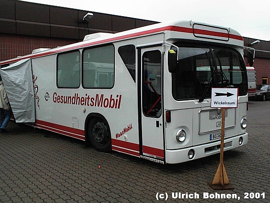 Unverkennbar ist die jetzige Funktion dieses MAN SL 200. Das "GesundheitsMobil" wurde am 23.09.2001 auf dem Bogestra-Betriebshof in Gelsenkirchen-Ückendorf abgelichtet. Bemerkenswert ist, dass ein Teil der vorderen Türe entfernt wurde und dafür ein eigenartig geformtes Fenster eingesetzt wurde.