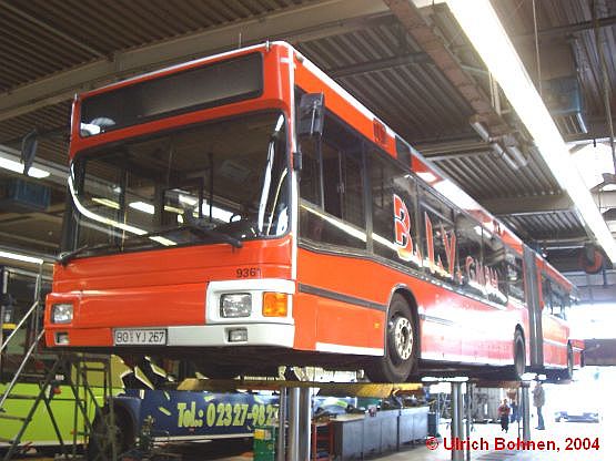 Standard bei fast jedem Tag der offenen Tür in einem ÖPNV-Verkehrsbetrieb ist ein aufgebockter KOM. In Bochum-Weitmar musste am 04.07.2004 der Wagen 9361, ein MAN A 11 (NG 262) aus dem Jahre 1993, für die besondere Aufgabe herhalten, als er bei leichtem Gegenlicht fotografiert wurde.