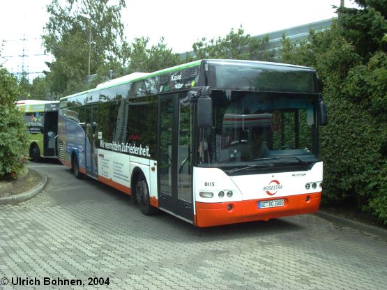 Hier ist ein Neoplan N 4416 Centroliner zu sehen. Das klimatisierte Fahrzeug mit der Nr. 0115 trägt die im Ruhrgebiet weit verbreitete NRW-Lackierung und stammt aus der 2001er-Gemeinschaftsbestellung der KÖR (Kooperation Östliches Ruhrgebiet).