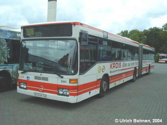 Dieses Bild zeigt einen Vertreter der 1. Niederflurbus-Standard-Generation: 1993 beschaffte die Bogestra eine Serie von Mercedes-Benz O 405 GN, die noch ohne den später charakteristischen "Knick" in den seitlichen Fenstern auskommt, da die Sitze allesamt auf Podesten installiert sind. Der Wagen 9364 musste draußen verweilen, weil in einem Teil der Bushalle Volksfestatmosphäre mit Bierbuden und Essensständen herrschte und somit kein Platz mehr zum Abstellen der Busse in den Hallen vorhanden war.